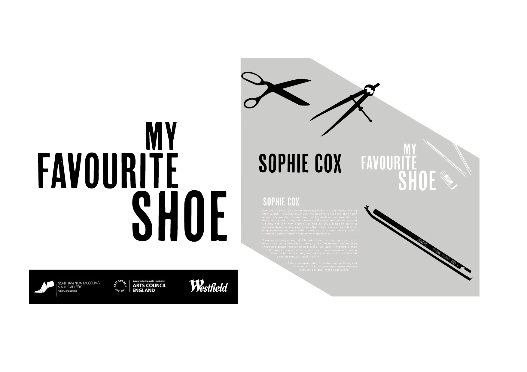 Graphic Identity for Northampton Museum and Art Galleries. This travelling exhibition was designed to create a dialogue between contemporary designers and the inspiration drawn from pieces from NMAG's huge historic shoe collection. The exhibition design (curated and designed by Ellen Sampson and our friends over at Install Archive) took it's cues from design workspaces, and we devised a simple but striking identity featuring a graphic 'stripe' that runs through the cabinet group, creating a a sense of flow and dynamism. Negative space was used to showcase the choice of materials